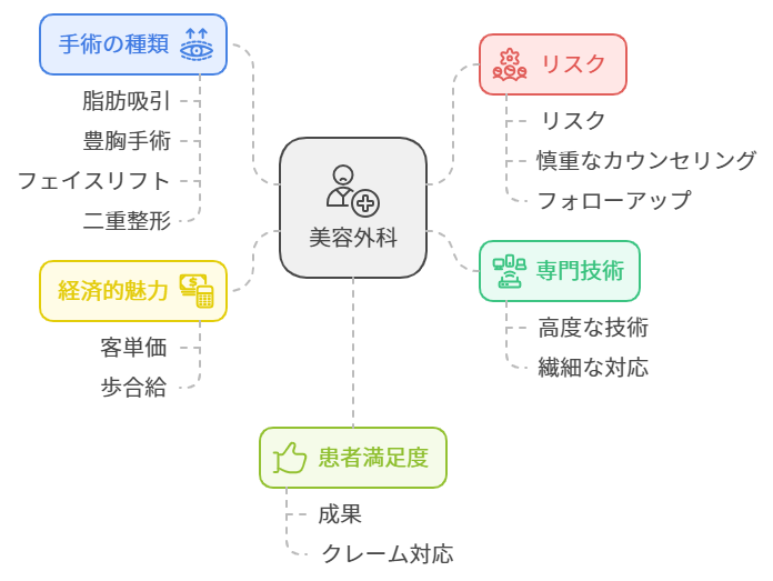 • 美容外科: 大規模な手術が主。技術力が重要で、フェイスリフト、豊胸、脂肪吸引などが代表的な治療。外科的なスキルを活かすチャンスが多い。