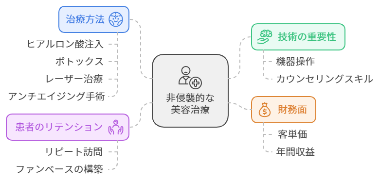 • 美容皮膚科: 手術を伴わない非侵襲的な治療が中心。ヒアルロン酸注入やボトックス注射、レーザー治療など、比較的軽度の治療を行い、患者の美的ニーズに対応。