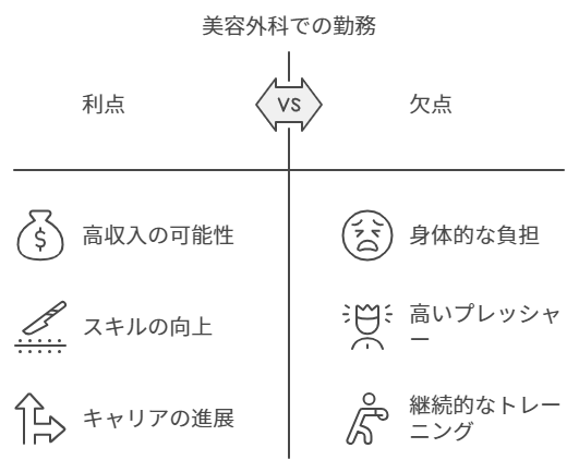 美容外科は客単価が高く、体力やスピード感が求められる一方、報酬も非常に高くなります。美容皮膚科は非侵襲的な治療が多く、リピーターを増やすことで安定した収入が得られ、ライフワークバランスが取りやすいです。
