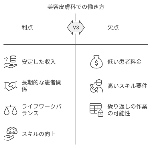 美容外科は多忙なスケジュールと高いプレッシャーを伴う一方、美容皮膚科は比較的余裕を持った働き方ができます。自分がどのようなワークライフバランスを求めているのかを考慮し、適切な選択を行うことが、長期的な満足感につながります。