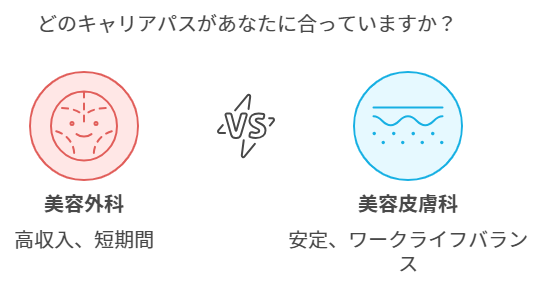 高収入を短期間で得たいなら美容外科、長期的な安定とライフワークバランスを重視するなら美容皮膚科と、自分のキャリア目標に合った分野を選ぶことが重要です。どちらの分野でも、技術力と患者対応力が重要ですが、外科的スキルか、機器を使った治療やリピーターを増やす能力か、強みを活かせる方を選ぶのが成功の秘訣です。