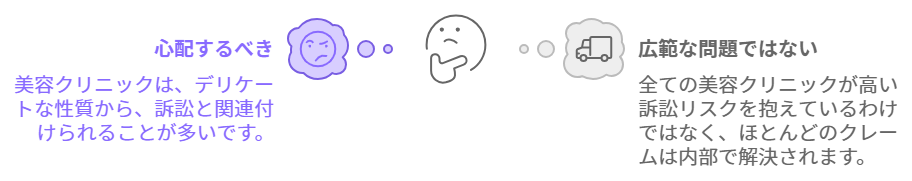 現実には、クリニックごとに状況は大きく異なります。日常的にクレームが発生するクリニックもあれば、トラブルがほとんどないクリニックも少なくありません。クレームやトラブルが訴訟に発展するケースは、一部のクリニックに限られており、頻繁に起こるわけではないのです。