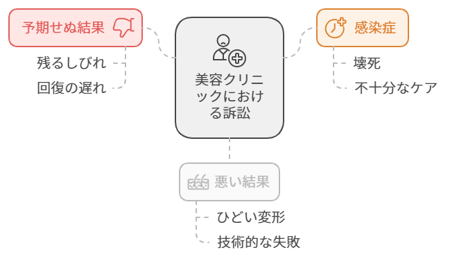 これらのケースでは、医師の技術やクリニックの管理体制が直接問われることが多いです。技術的な問題か否かによって、訴訟リスクが大きく変わってくるというのが、美容クリニックの現実です。