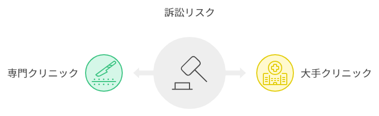 これらのクリニックでは、技術や対応が必ずしも不十分でないにも関わらず、捉えられ方によって訴訟が発生しやすい環境にあると言われがちです。また、大手クリニックや専門クリニックでは、クレーム処理専門部署を設置していることも多く、訴訟リスクに対する管理体制を整えている場合もあります。そうした背景もあるため、大なり小なりの訴訟を抱えている可能性は否定できませんが、これがそのまま「訴訟が頻繁」という印象に繋がるわけではないことを理解しておきましょう。
