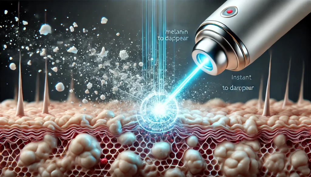 例えば、シミやそばかすを治療する場合を考えてみましょう。このような色素沈着には、メラニンという肌の色素に反応する波長のレーザーが使用されます。このレーザーは、メラニンにだけ吸収され、他の肌組織にはほとんど影響を与えません。結果として、シミをピンポイントで取り除くことができます。