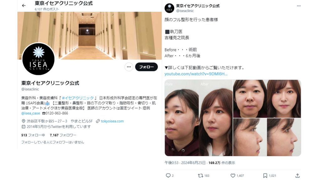 美容クリニック関連のSNSでは、クリニック公式アカウントではなく医師個人名のアカウント運用に積極的なクリニックもあります。今回はクリニック公式アカウントのみピックアップしています。
