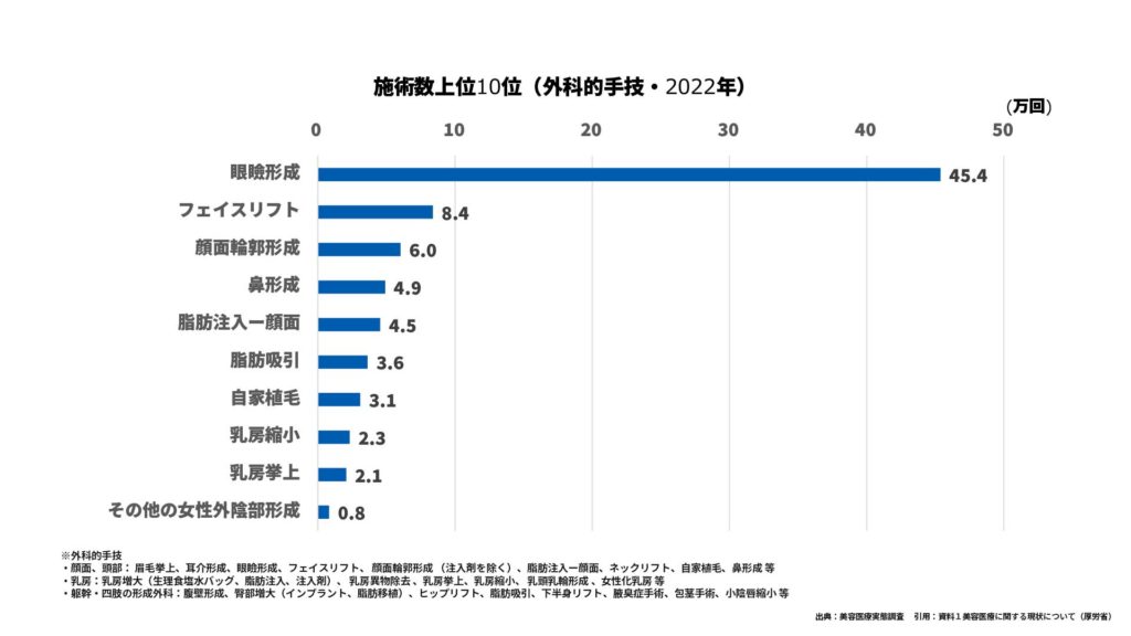 美容医療では、ボトックス注射やヒアルロン酸注入などのシンプルな施術から、脂肪吸引や豊胸などの外科的手技まで、幅広いメニューでニーズがあり、特に眼瞼形成は若年層に人気で、今後も高い需要が見込まれます。