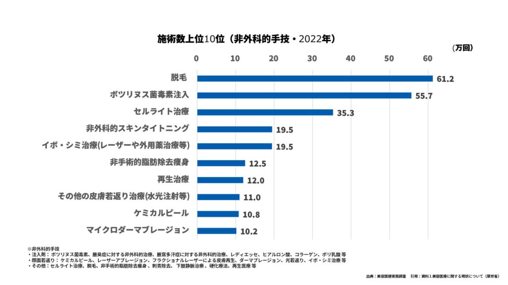 非外科的手技(ボトックス注射やヒアルロン酸注入など)の需要が特に高まっています。これらの手技は、侵襲性が低く、ダウンタイムが短いため、忙しい現代人にとって魅力的です。実際、2022年には非外科的手技の施術数が287万回に達し、全体の約73%を占めています。また、これらの非外科的手技によって顧客化した顕在層の拡大は外科的手技の治療件数にも影響を与えており、形成外科医(美容外科)の需要も同時に高まっています。