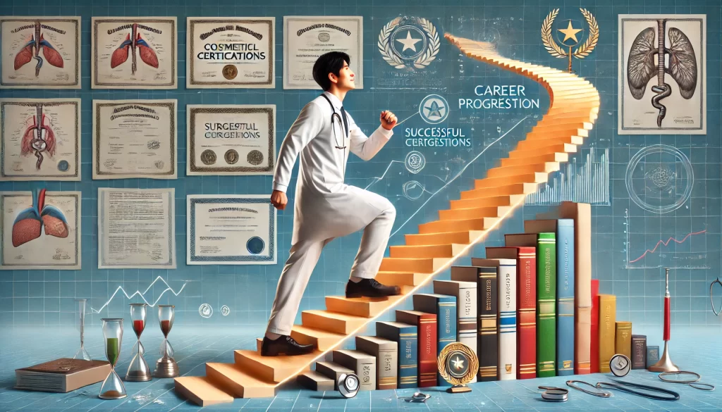 セルフブランディングを成功させ、競合との差別化を図ったら、次に目指すのはキャリアアップです。美容外科医としての成長を続け、さらに高いレベルで活躍するためには、継続的な学びと実績の積み重ねが不可欠です。この章では、キャリアアップに向けた具体的なステップについて見ていきます。