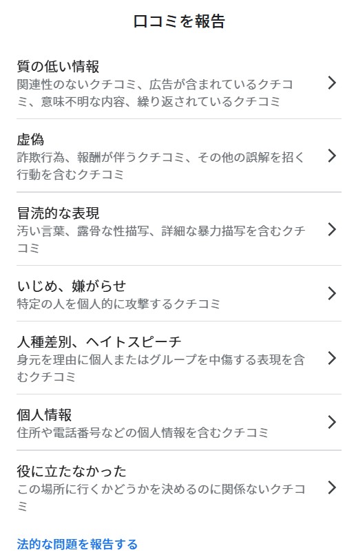 口コミには個人の感情が含まれていて当然ですが、以下のような表現が含まれる場合、Googleポリシー違反や法的リスクとして扱える可能性があります。