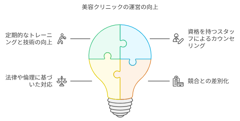 これらの施策を通じて、スタッフの教育や独自のサービス、顧客体験の向上に力を入れることで、他のクリニックとの差別化を図り、信頼されるクリニック運営が可能となります。