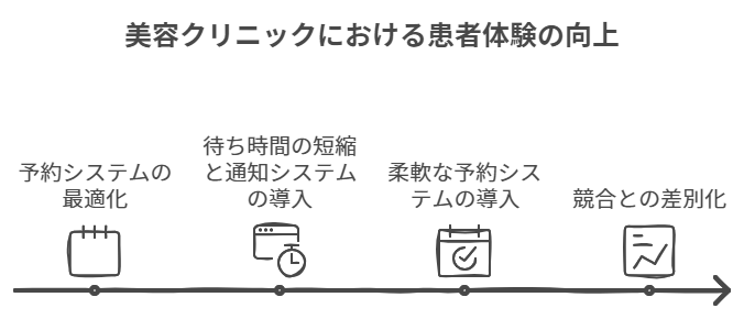 他の美容クリニックとの差別化として、待ち時間ゼロを目指した予約システムや、迅速かつ正確なスケジューリングの実現を掲げることも効果的です。また、患者さんが待ち時間中にリラックスできる環境づくりや、サービスの提供を強化することで、競合と差別化を図り、より信頼されるクリニックを目指します。