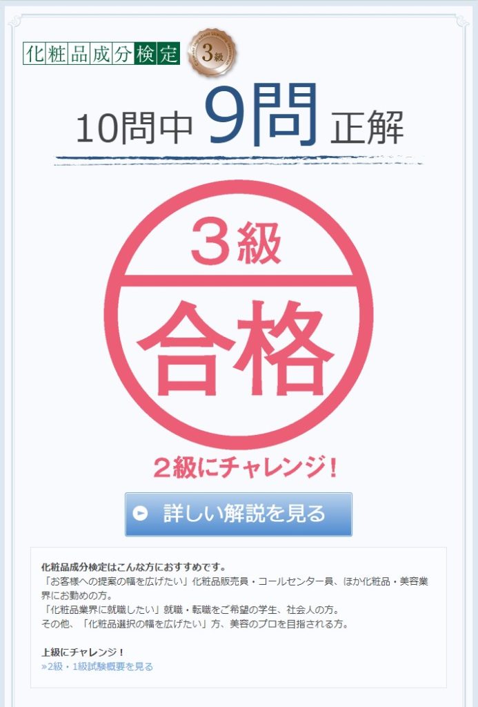 化粧品成分検定3級はWEBで10問回答するだけで合格できる優れものでしたが、おおよそ直感で回答すると不合格になりそうな程度には難しかったです。